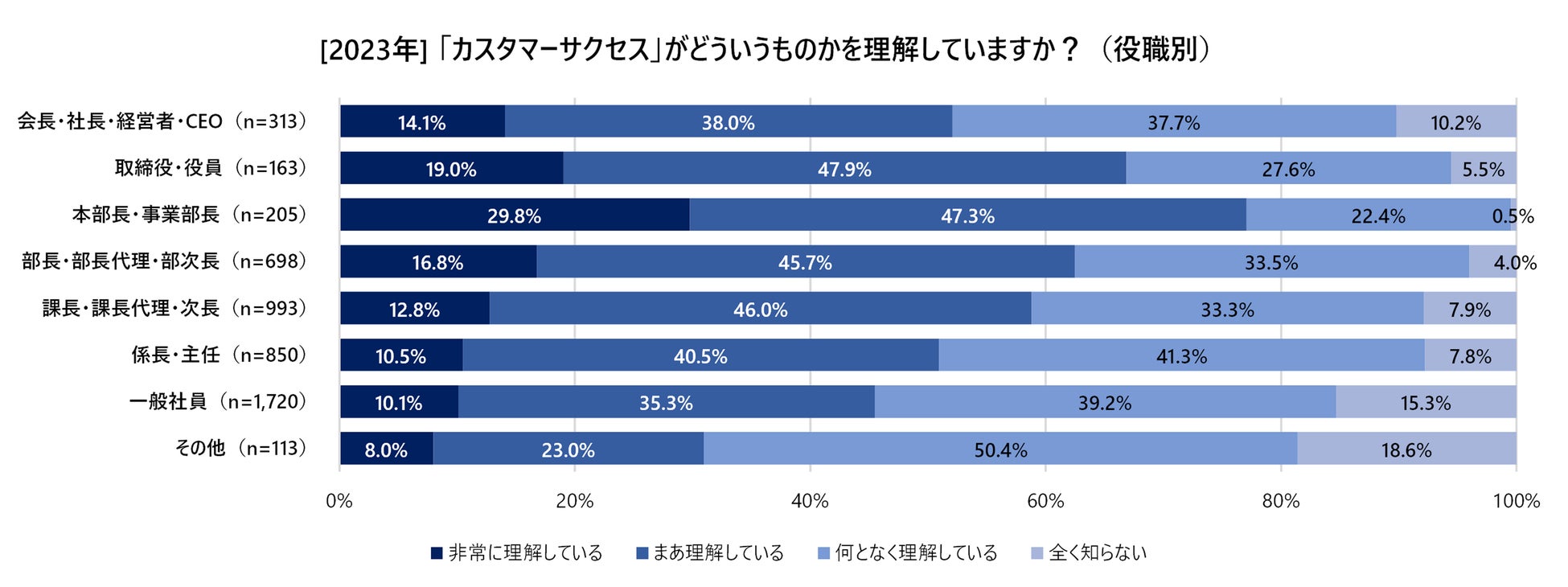 まず、役職別でカスタマーサクセスに対する認知および理解を見てみると、企業のトップを務める人たちの実に81.1%が「カスタマーサクセスという言葉を聞いたことがない」という衝撃の結果が示されました。