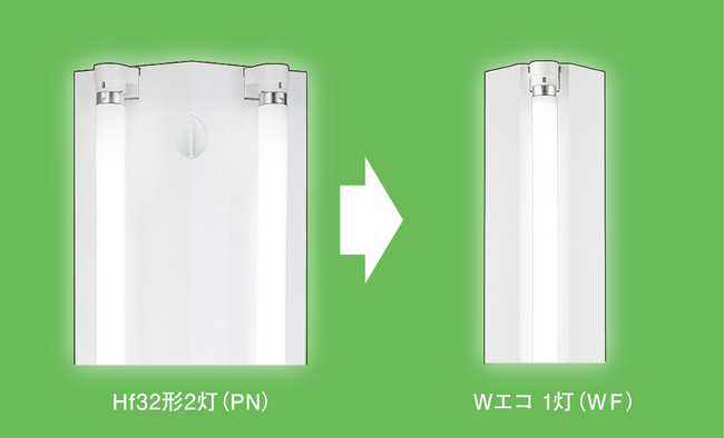 「Wエコ 環境配慮型照明器具」は、高効率な63形G-Hf蛍光灯を使用し、「省エネ」&「省資源」のダブルでエコを追求。「1灯用器具」では、ランプ2灯の明るさを1灯で実現。器具1台当たりの使用ランプ本数が1/2になります。その後発売した「2灯用器具」では、器具2台分の明るさを1台で実現、設置台数が1/2になります。さらにこの度、ランプ寿命がおおよそ24,000時間の「省エネ出力型(WSタイプ)」を追加し、ランプ交換回数「2回が1回」と1/2になります。