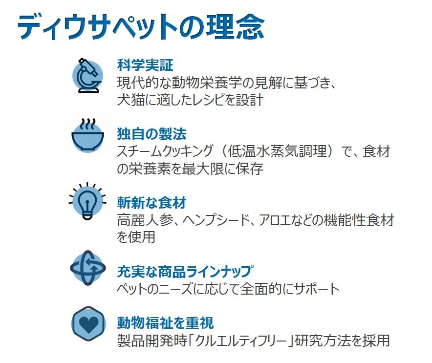 ディウサペットは、最高品質のナチュラルペットフードとペットケア製品を使用し、家族と生活を共にしているペットを対象とし(そのような環境では自然に病気の影響を受けますが)クルエルティフリーで、科学的証拠に基づく製品の研究開発を実施しています。 (クルエルティフリーとは、動物保護の観点から、商品や商品開発の過程で、動物を傷付けたり、動物テストによって殺したりしていないことを示す企 業方針のこと)