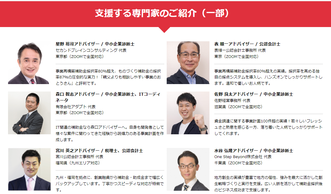 それら面倒な手続きをフルサポートしてくれる認定支援機関を探せるのが、「認定支援機関さがせる窓口」です。元・補助金審査員、中小企業診断士、税理士、行政書士など13名の専門家の中からコンシェルジュがご紹介します。