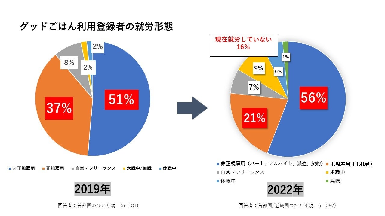 2022年の調査では、グッドごはん利用者の56%がパートやアルバイトなどの非正規雇用で働いていると回答しています。シフト制の仕事で収入が安定しないことはもとより、新型コロナウイルスの影響によってシフトの削減や、子どもの休校対応により仕事が減ってしまったという回答が多数見られました。