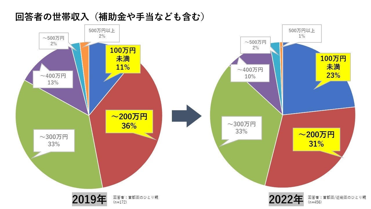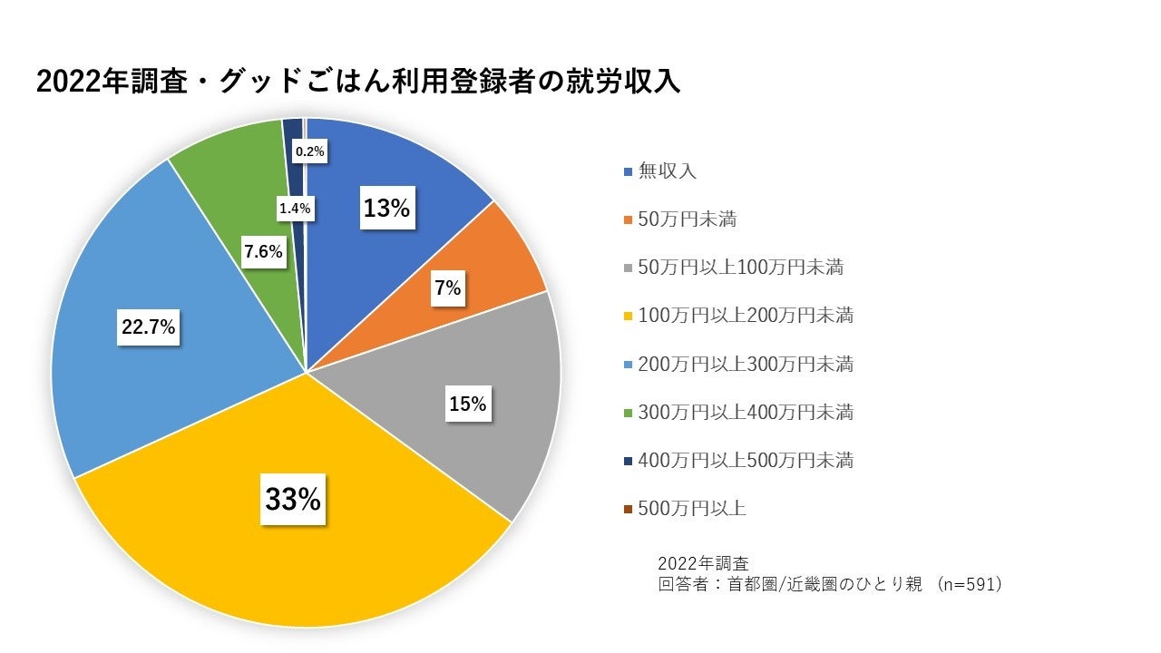 ひとり親家庭を対象としたフードバンク事業「グッドごはん」を運営する認定NPO法人グッドネーバーズ・ジャパン(東京都大田区)は、2022年4月から5月にかけて、食品支援の利用登録者を対象に2021年の年収に関するアンケート調査を行いました。 2019年に行った同様の調査と回答を比較した結果、ひとり親家庭は2年半前よりさらに厳しい経済状況に置かれていることが分かり、新型コロナウイルスの影響が明るみに出る結果となりました。