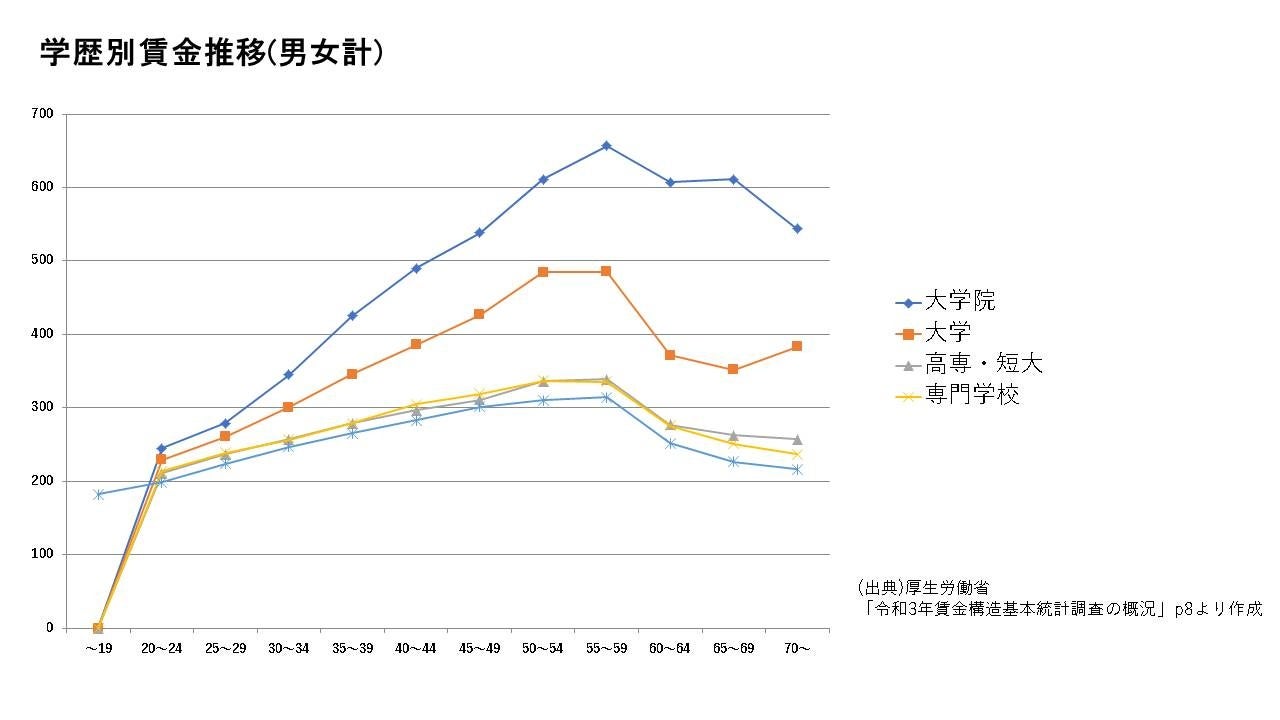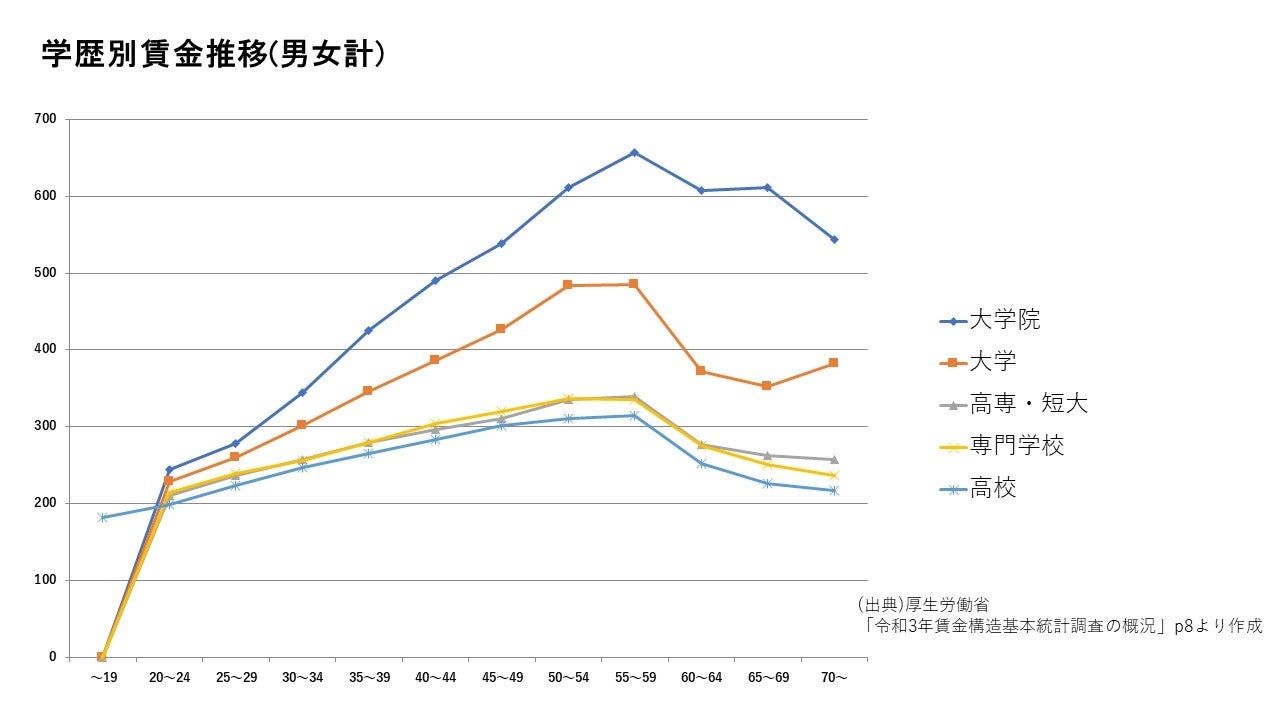 そして、大卒の方が高卒よりも給料水準が高いことは私たちの生活の実感としても明らかですが、厚生労働省の調査でも報告されています。(令和3年賃金構造基本統計調査)