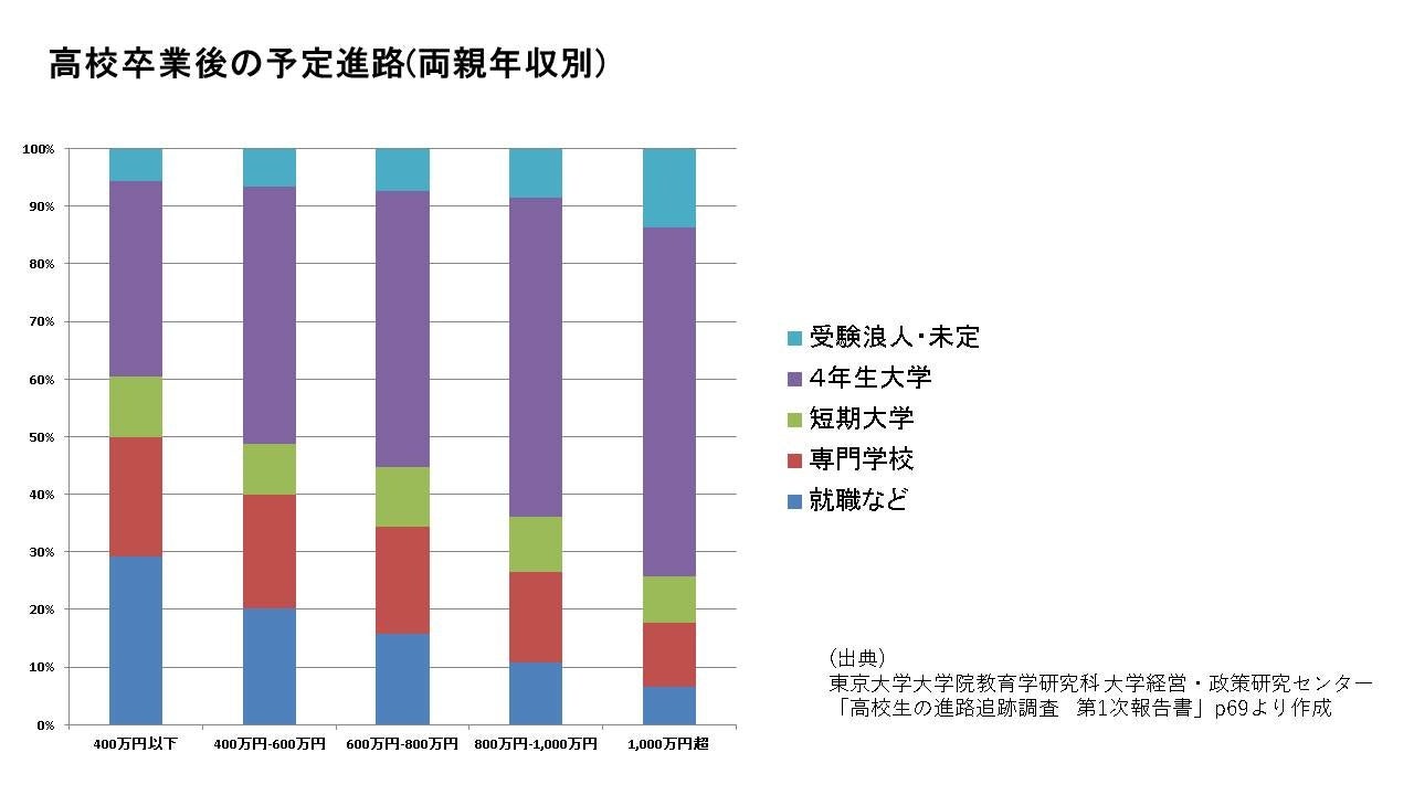 経済的な理由で大学進学を諦める低所得家庭は多く、親の年収が高いほど4年制大学への進学率が高いという研究結果があります(高校生の進路追跡調査 第1次報告書/東京大学大学院教育学研究科 大学経営・政策研究センター)。