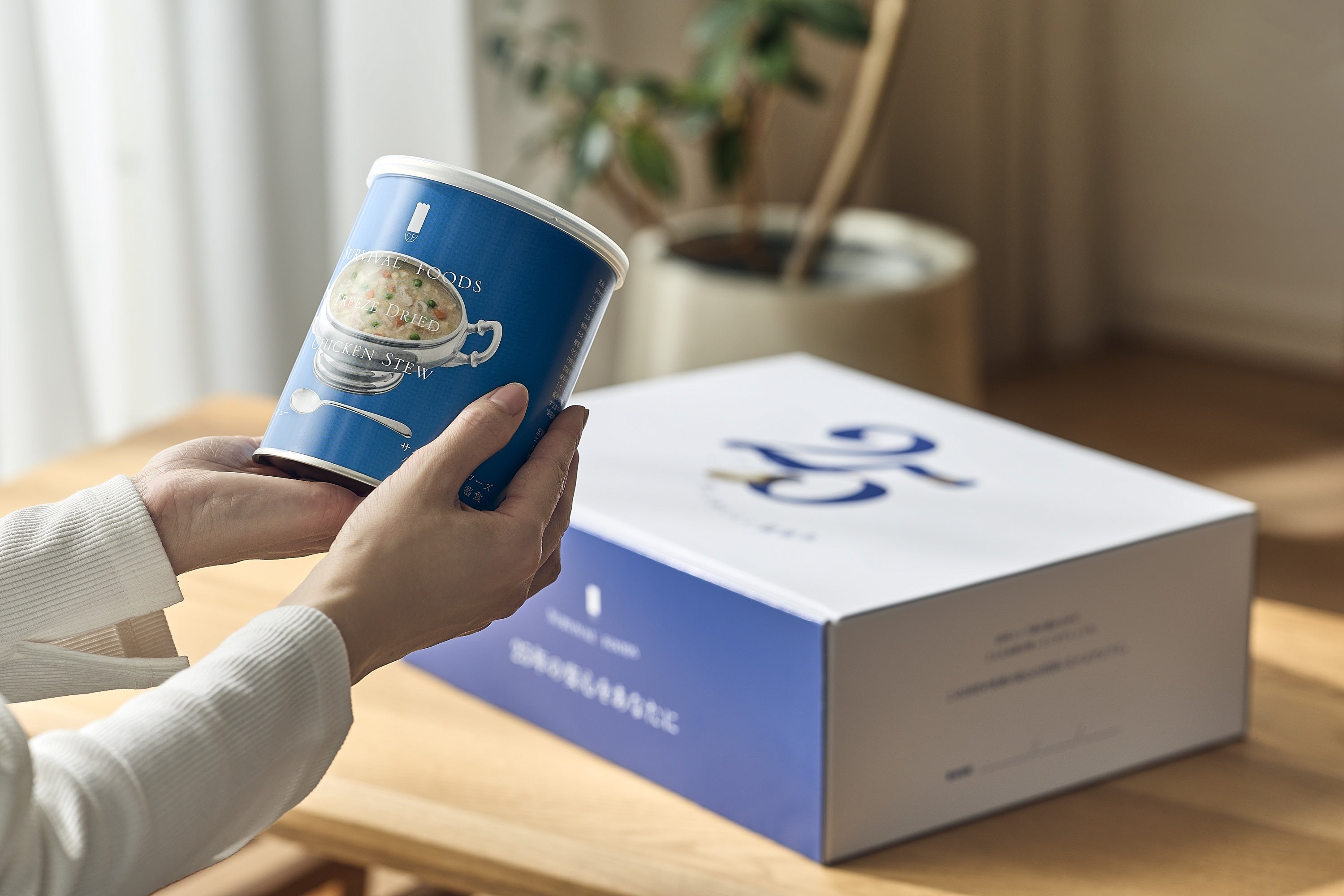 続いて、「それは“もしもの安心”という――未来への贈り物」という言葉とともに、25年保存可能な非常食『サバイバルフーズ』のチキンシチューとギフトボックスが登場。缶が行進するように動きながら、空いていたスペースにぴたりと収まるユーモラスな演出を加えました。