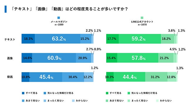 メールマガジンとLINE、双方でテキスト・画像・動画をどの程度見ているか、という質問では、「すべて見る」「気になった情報だけ見る」と回答した割合を見ると、テキスト・画像・動画ともにメールマガジンのほうがより見られていることがわかりました。一方で画像に関しては「すべて見る」を選択した割合がLINEのほうが多くなっており、クーポンを含めた画像情報への注目度は高いことが伺えます。