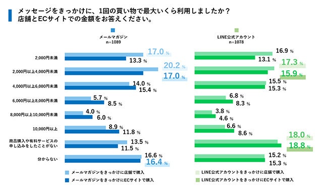 決済額に関しても、ECでの購入はどの金額帯でもメールマガジンがLINEを上回っています。メールマガジンは4位に10,000円以上という高額な金額帯がランクインしていることからも、メールマガジンはWebでの購買行動に影響しているようです。