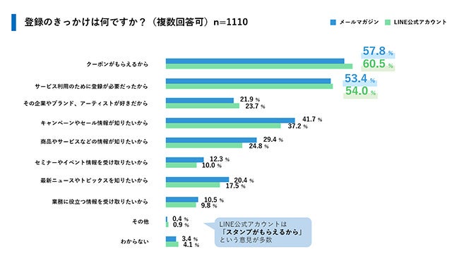 登録のきっかけとして、「クーポンがもらえるから」という理由がともに1位となっていますが、メールマガジン=57.8%、LINE=60.5%とLINEのほうがより顕著にクーポン利用を目的としていることがわかります。