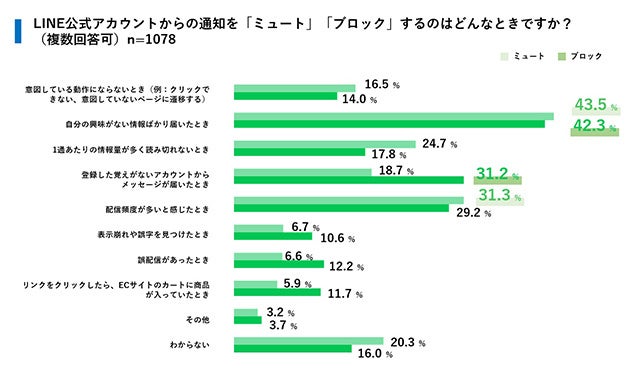 メールマガジンで配信停止の原因として高い割合を持つ「配信頻度」については、LINEではやや低い数値となっており、ブロックよりもミュートの原因となることがわかります。