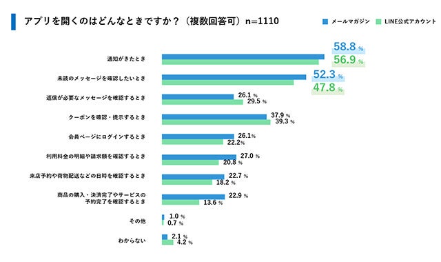 アプリを開くタイミングに関する質問では、「通知がきたとき」が双方とも最多となりましたが、LINEはメールマガジンに比べて、「クーポンの確認・提示」の割合が上回っています。これはLINEを利用した実店舗でのクーポン利用が定着していることが関係していると思われます。