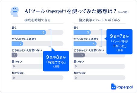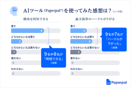 9名中8名が「校正を時短できる」と回答。同じく7名が「論文執筆のハードルが下がる]と回答