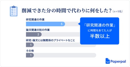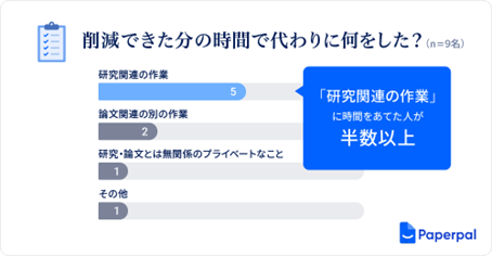 さらに、AI英文校正・翻訳ツールPaperpal使用有無による所要時間が「少し減った」と回答した方に、削減した分の時間を何に当てたかを聞いたところ、半数を超える5名は削減した分の時間を「研究関連の作業」に当てたと答えた。