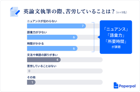 研究室メンバーに、英論文執筆の際に、苦労していることを聞いたところ、過半数を超えるメンバーで、