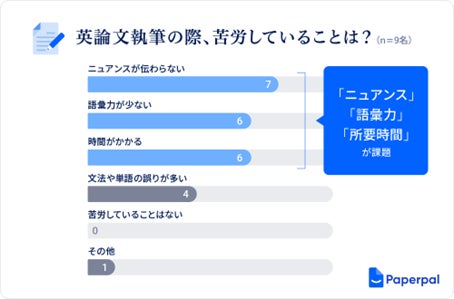 一方で、苦労していることはないという回答は得られなかった。研究メンバーにおいて、英論文執筆で研究の成果を思い通りにアウトプットすることは難しいということが感じられる結果となった。