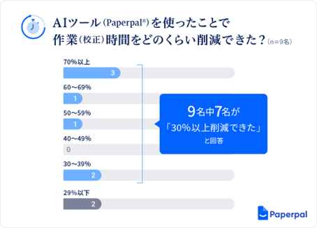 続いて、AI英文校正・翻訳ツールPaperpalの使用有無による所要時間の削減率について聞いたところ、9名中7名が30%以上削減したと答えた。