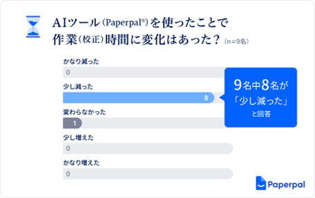 研究室メンバーに、過去にご自身で校正した場合と、今回AI英文校正・翻訳ツールPaperpalを使用して校正を行った場合とを比べて、作業時間に変化があったかを聞いたところ、9名中8名が「少し減った」と回答した。