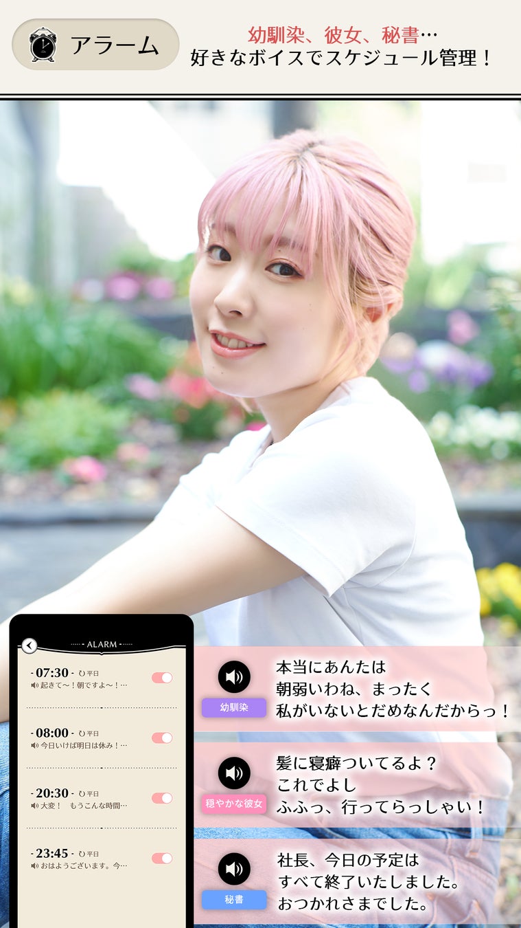 定期的にアラームボイスが配信されます。本人の日常ボイスのほかにも、さまざまなキャラクターやシチュエーションを搭載!目覚ましとして普段使いにも最適!