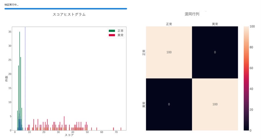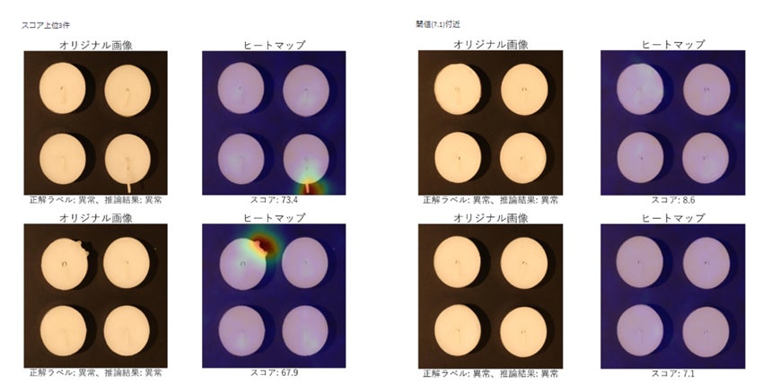 正常品が低いスコア、異常品が高いスコアへとそれぞれ分布される場合、AIは正しく画像の特徴を捉えることができている、つまり優秀なAIモデルを作成することができたと言えます。