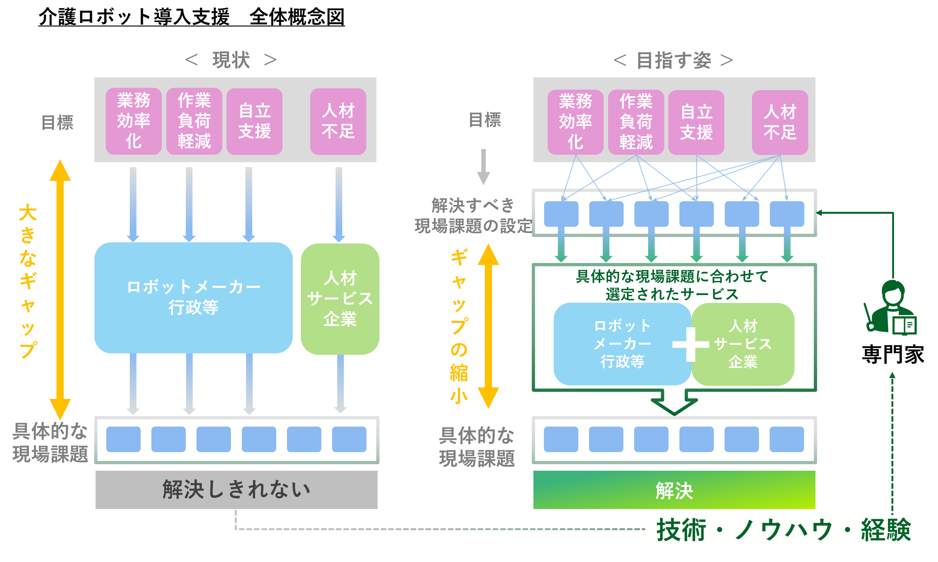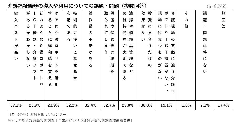 介護ロボット導入における課題は幅広くある中で特に導入コストに注目が集まりますが、業務改善実現への不確かさ、適切な機器の選択や使いこなす技術への不安など施設ごとの状況を俯瞰的に判断し、導入における具体的かつ総合的な支援を受けられる体制が不足していることも解決が急がれる課題です。