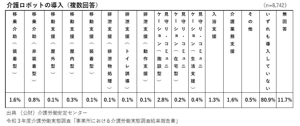 介護ロボットの活用は介護従事者の職場への定着促進や生産性向上に向けた対策の1つとして挙げられ、多種多様な機器が開発されるとともに活用促進が図られてきました。介護ロボットの活用は、介護従事者の身体的または精神的負担や作業負担の軽減につながり、従事者の離職低減と職場への長期定着を実現することや、作業効率の向上による介護施設の生産性の向上が期待されています。しかしながら、約80%の介護施設で介護ロボットは未導入であるのが現状です。