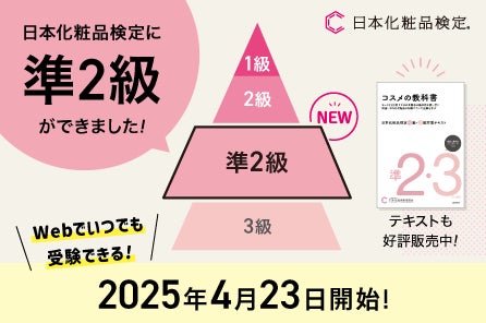 累計受験者数が158万人*1を超え、美容業界で最もスタンダードな資格へと成長しつつある文部科学省後援*2「日本化粧品検定」を主宰する一般社団法人日本化粧品検定協会(本社:東京都中央区、代表理事:小西さやか、以下当協会、URL:https://cosme-ken.org/)は、2025年4月23日(水)より、既存の2級と3級の間に位置づけられる新たな級『日本化粧品検定 準2級』の受験を開始いたします。