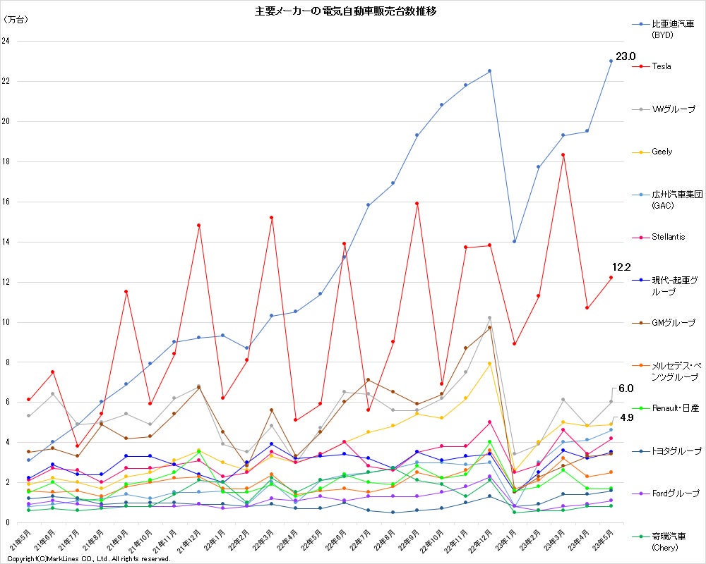 新モデル「海鴎(Seagull)」をはじめ各モデルの販売が好調なBYDが前月からさらに台数を伸ばし首位を独走。今までの最多販売であった、2022年12月の22.5万台を0.5万台上回り、2023年5月は23万台となった。広州汽車集団(GAC)もAion SやAion Yの販売台数が好調であるため、毎月順調に販売台数を伸ばしている。
