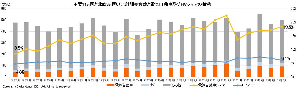 主要11カ国とノルウェー、スウェーデン、フィンランドの北欧3カ国(計14カ国)における5月の電気自動車販売台数は、92.8万台となった。前年同月比は45.7%増、前月比も15.9%増となった。