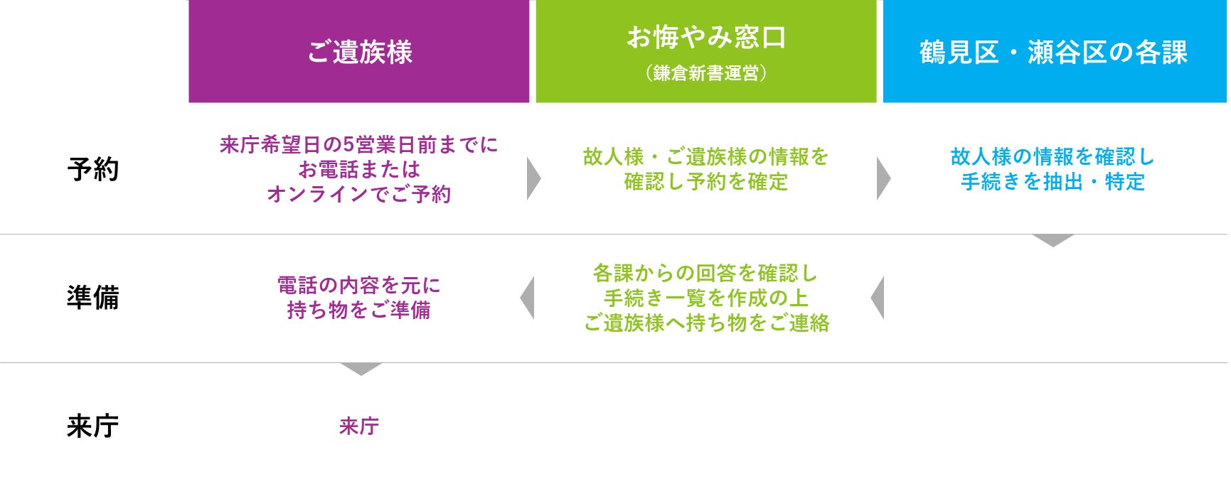 こうした背景から、横浜市でも「お悔やみ窓口」の設置にむけた検討を行い、この度、鶴見区・瀬谷区での試行運営が開始するに至りました。