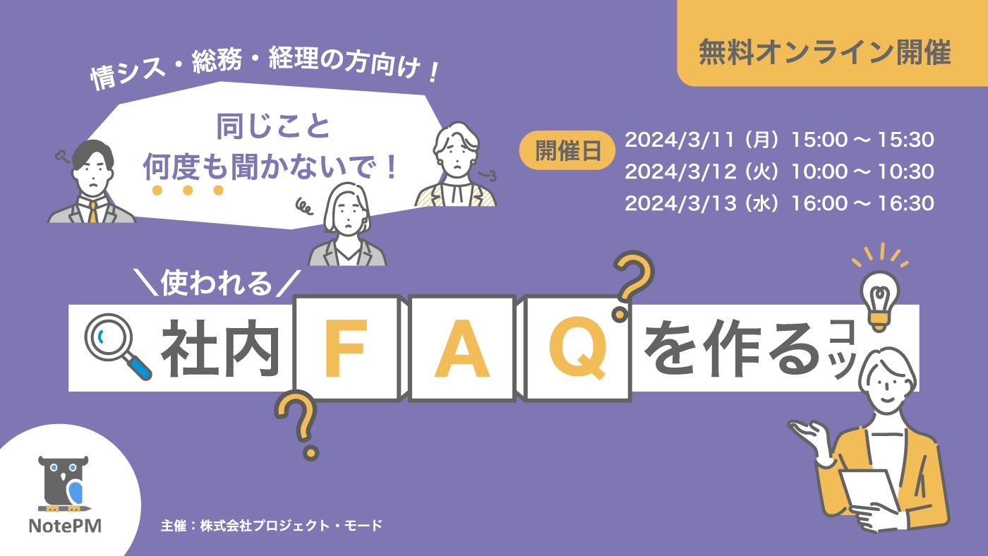 株式会社プロジェクト・モードが提供するナレッジマネジメントSaaS「NotePM ( https://notepm.jp )」は、オンラインセミナー『情シス・総務・経理の方向け「同じこと何度も聞かないで!」使われる社内FAQを作るコツ』を開催いたします。