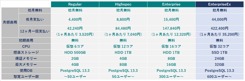 今回の新プラン追加で、大規模ユーザーでも快適に利用できるハイスペックなサーバーを低価格で導入したいというお客さまのご要望にお応えし、600ユーザー以上のお客様でも快適にご利用いただける「EnterpriseEx」がラインナップに加わりました。