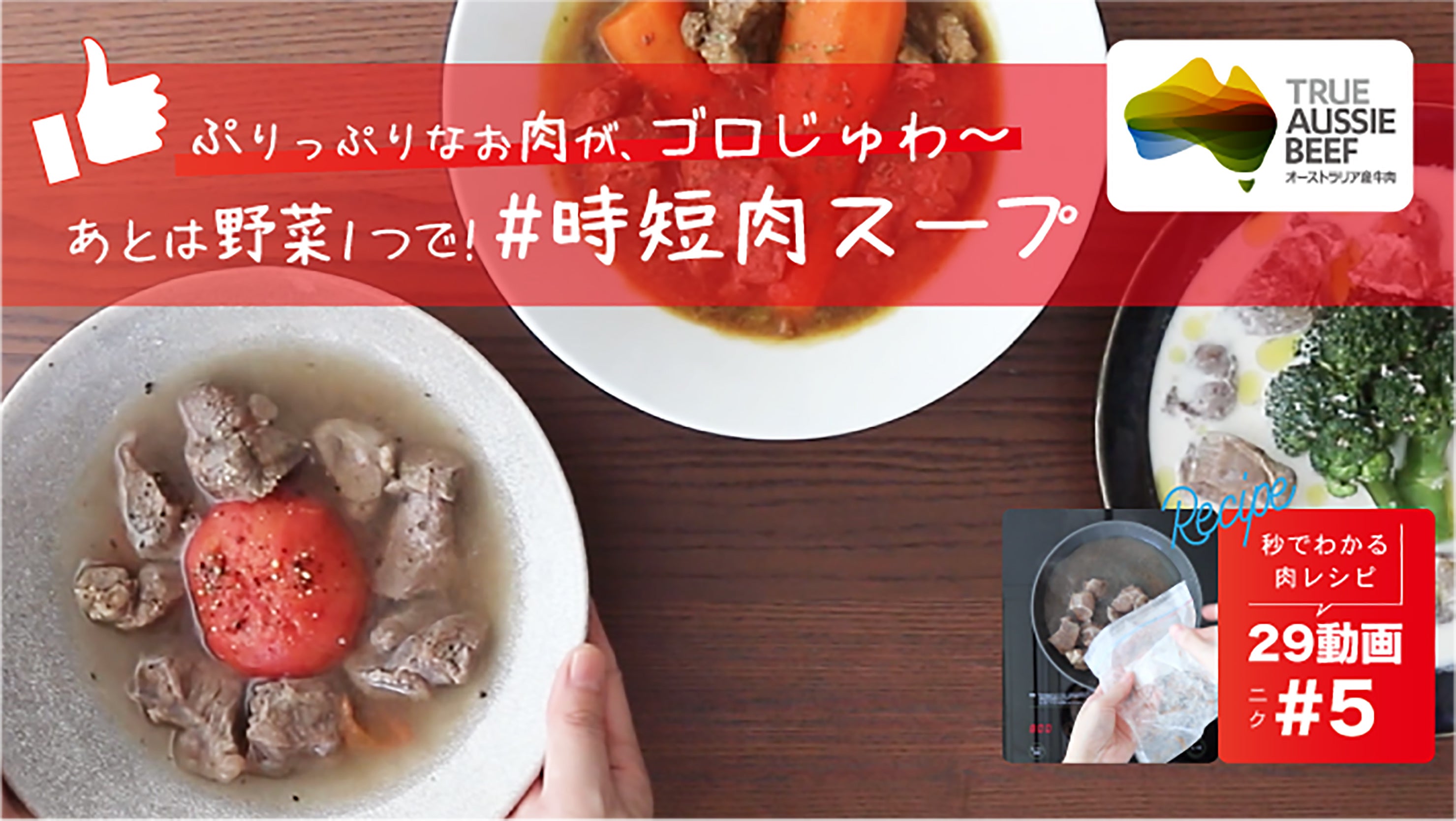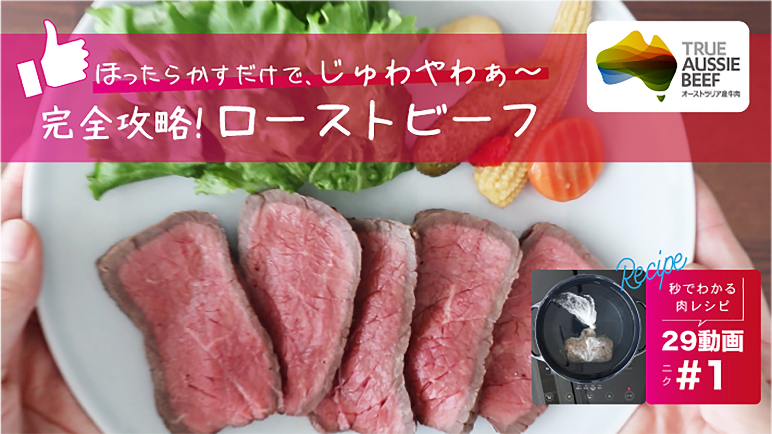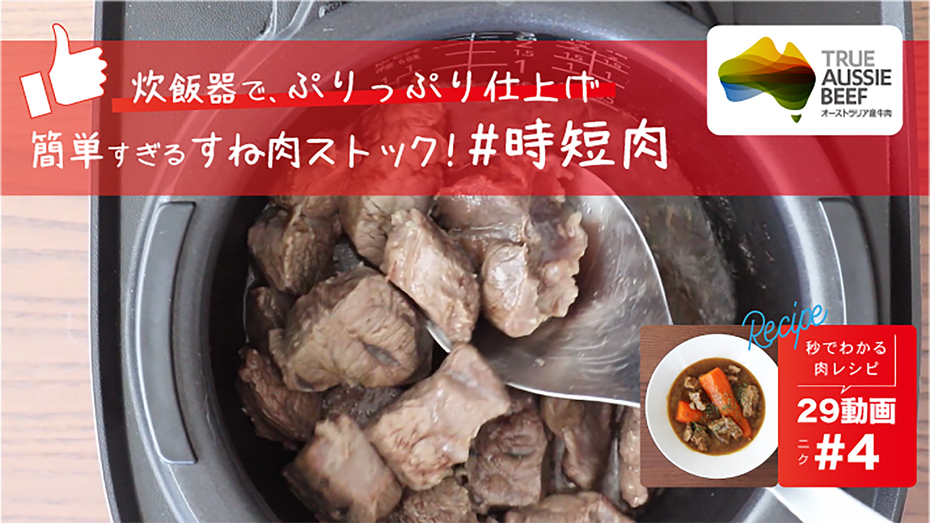 29動画は、短い時間に料理のワンテクニックをまとめたレシピ動画です。「茹でるだけでできるローストビーフ」は塊肉への火入れのテクニック、「#時短肉 」はすね肉を炊飯器で調理しストック食材化するテクニックなど、オージー・ビーフをもっと楽しむレシピ動画をどうぞお楽しみください。