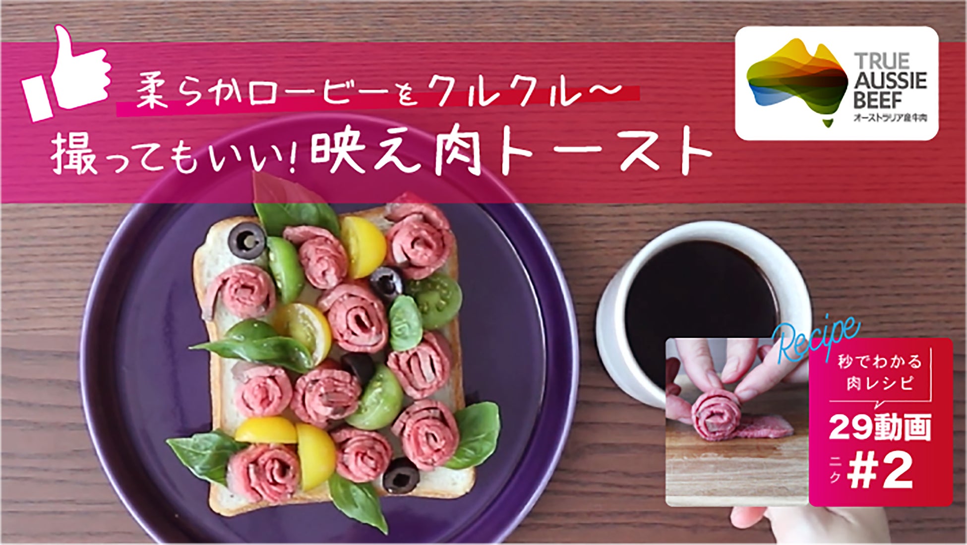 「私でもできそうな簡単牛肉レシピ!」をコンセプトに、オージー・ビーフを用いた牛肉レシピのテクニックを29秒の動画にまとめたレシピ動画です。シンプルな材料で、味も見た目もワクワクするようなレシピばかり。料理上手な方も料理に挑戦したい方もお楽しみ頂けます。