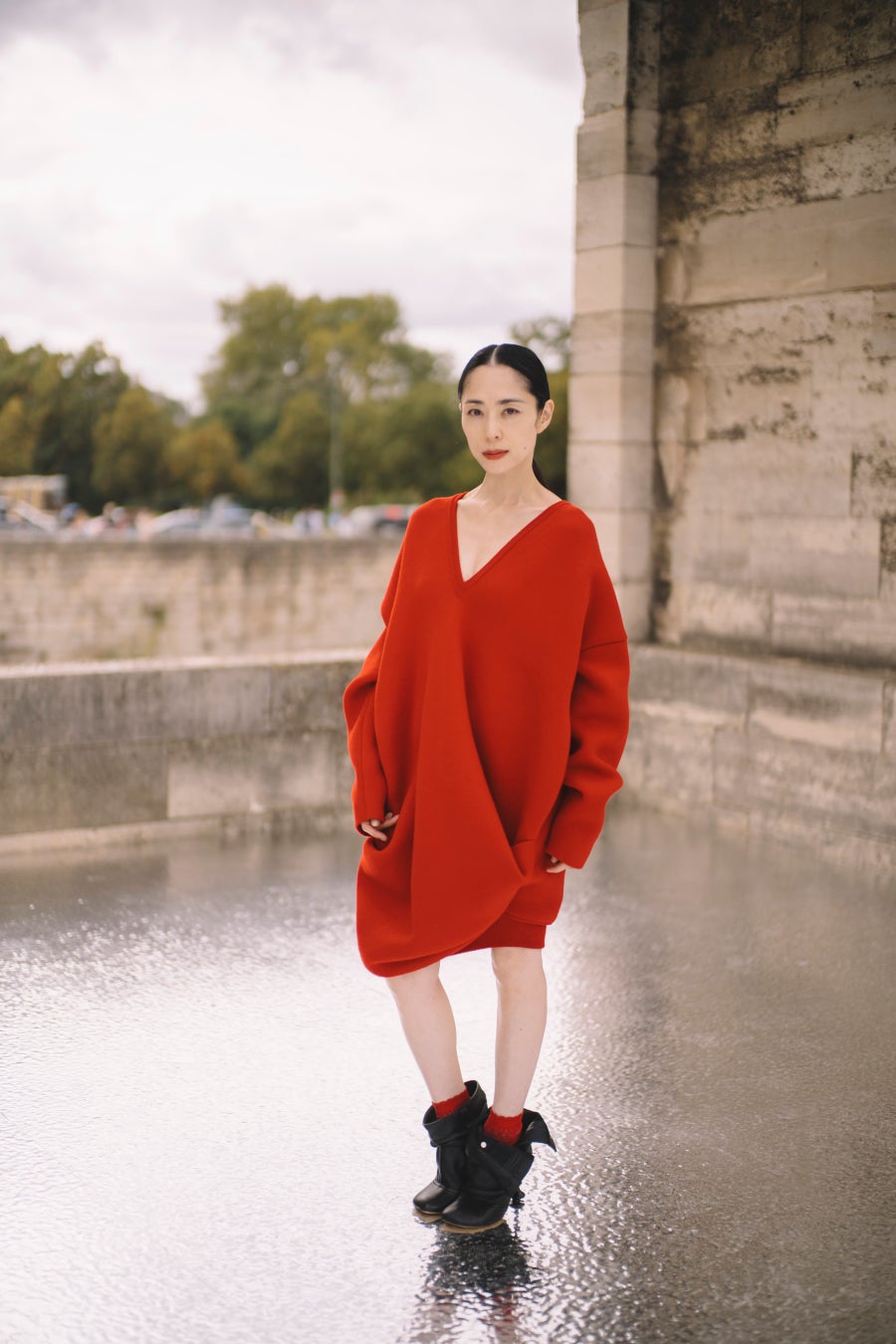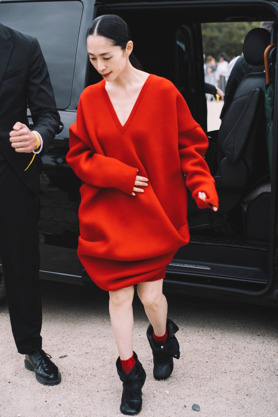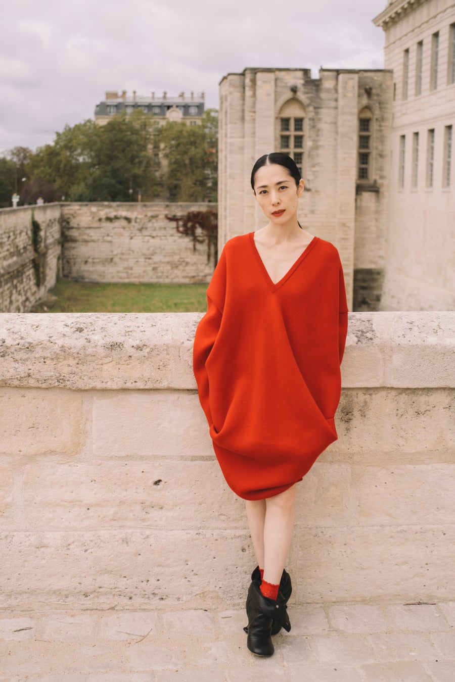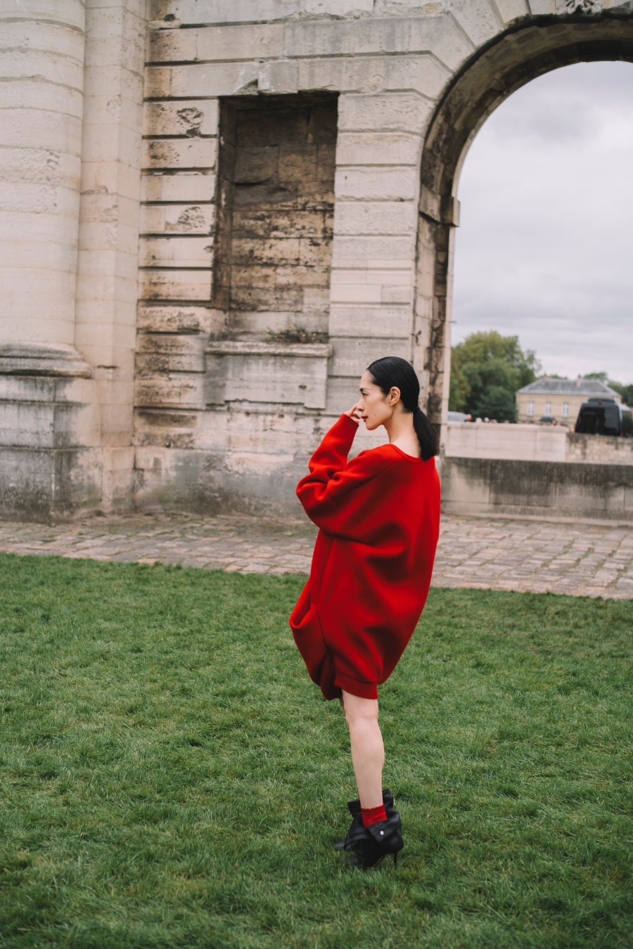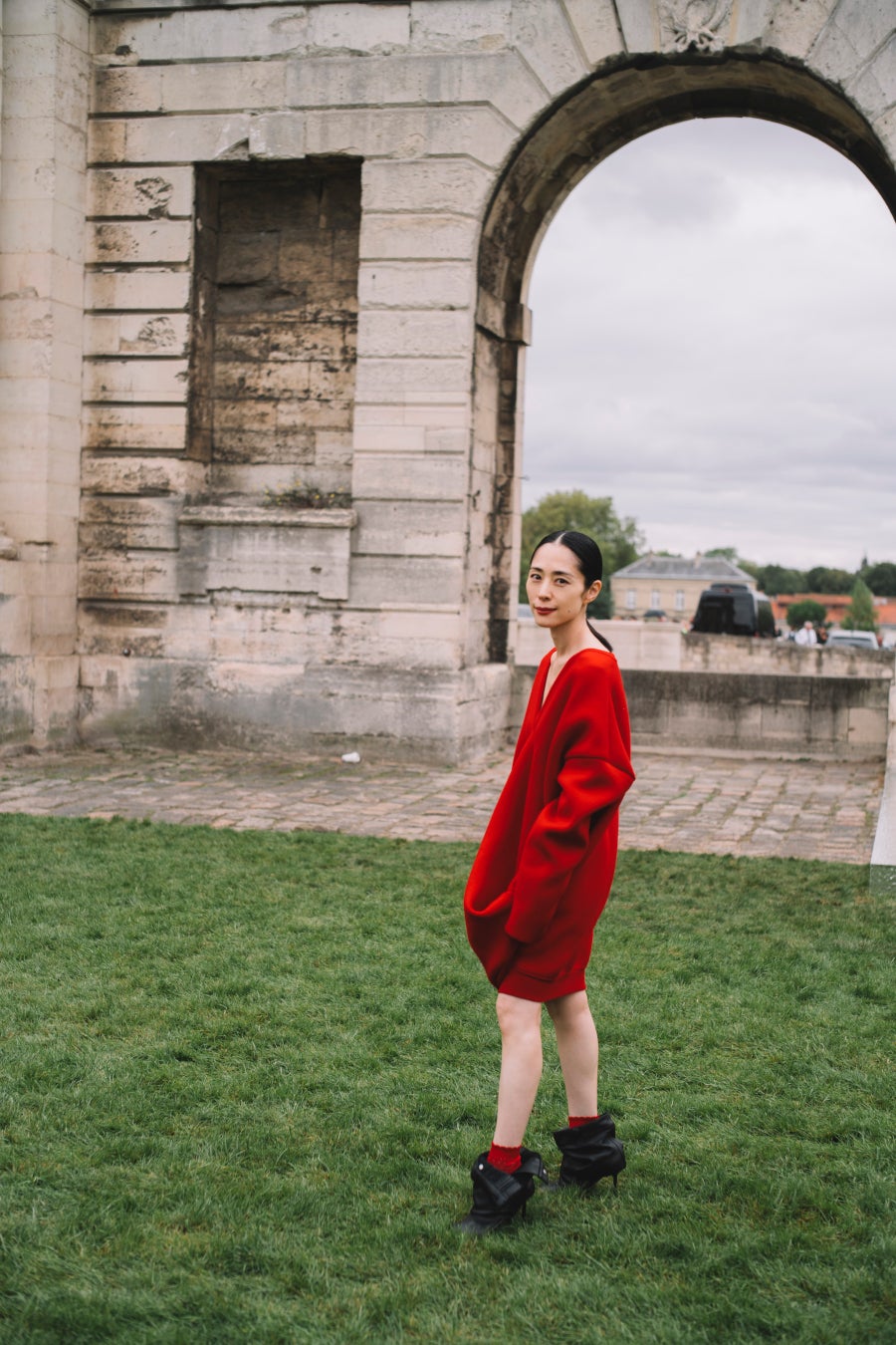 パリ東部にある広大なヴァンセンヌ城にて行われたSS24 ウィメンズショー。ファッションショーへの来場は今回が初めてとなる深津氏は、あでやかなレッドに染まったウールブレンドニットのドレープドレスと、5ポケットジーンズのデザインが融合したナパラムスキンのトイ パンタ ブーツを着用しました。