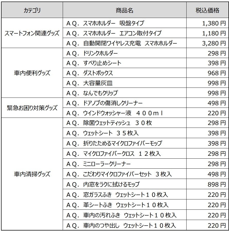取り扱いアイテムは「AQ.」から、オートバックス店舗でも取りそろえる人気商品を中心に、コンビニサイズにリサイズしたウインドウォッシャー液や、スマホ関連や車内清掃グッズ、ゴミ箱、ウェットシートなど、お客様が購入後すぐに使えるカー用品21アイテムを取りそろえています。