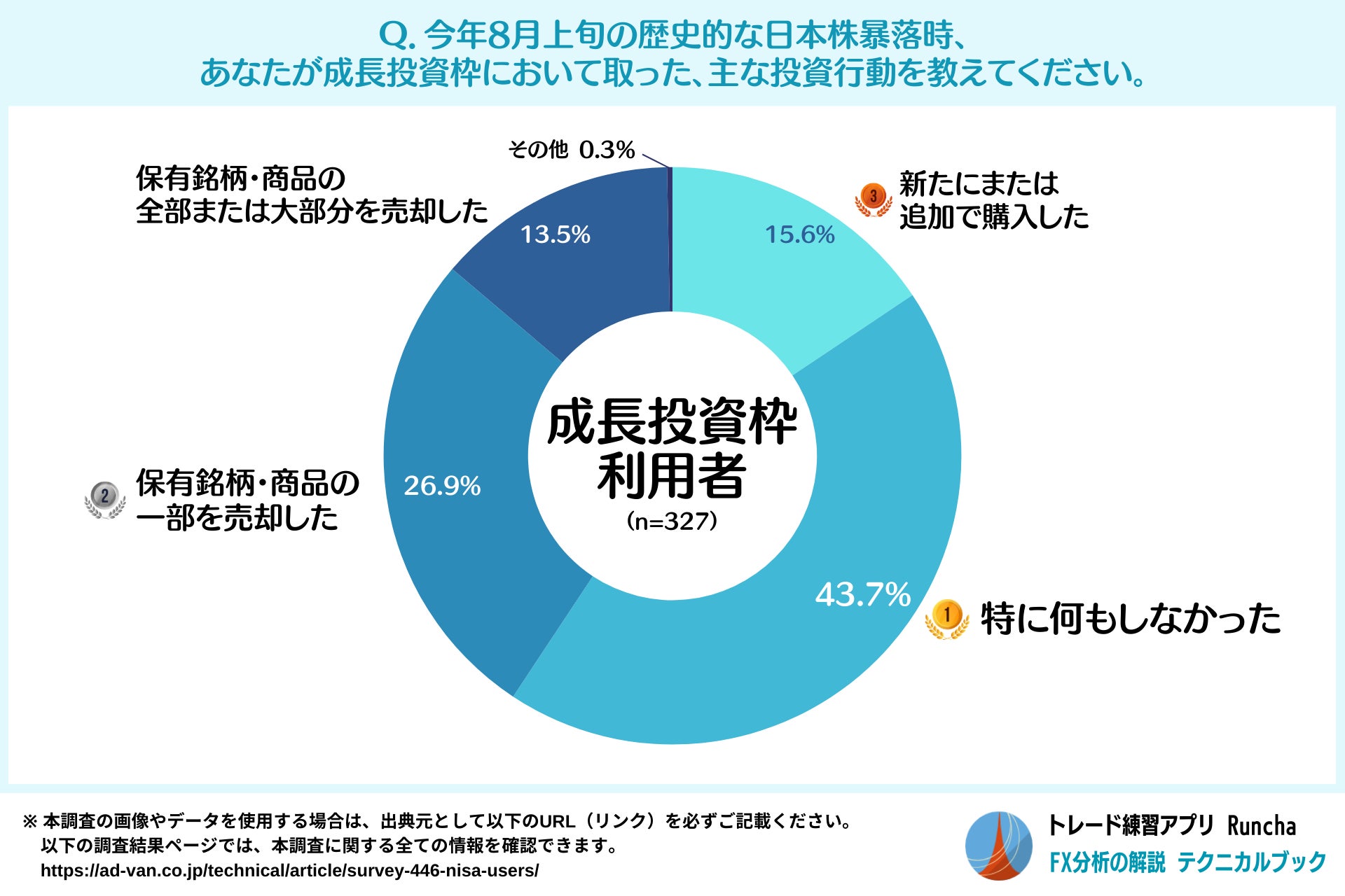 以下のグラフは、2024年8月上旬の歴史的な日本株暴落時における、成長投資枠での投資行動について質問した結果です。