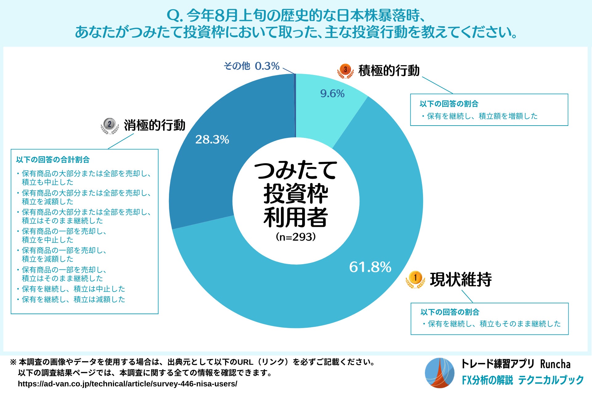 以下のグラフは、2024年8月上旬の歴史的な日本株暴落時における、つみたて投資枠での投資行動について質問した結果です。