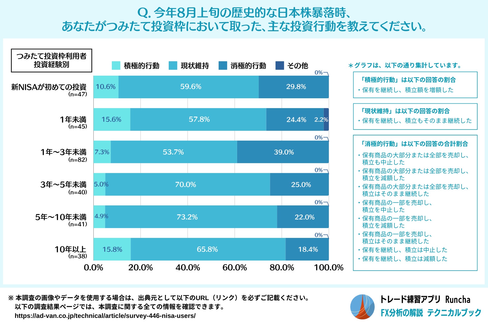 投資専門サイト『テクニカルブック』(https://ad-van.co.jp/technical/)は、2024年8月上旬の日本株暴落時における新NISA利用者の投資行動を調査する目的で、新NISAを利用したことがある20~69歳の男女446名を対象にアンケートを行いました。本調査からは、投資経験によって暴落時の判断・行動に違いが見られることがわかりました。