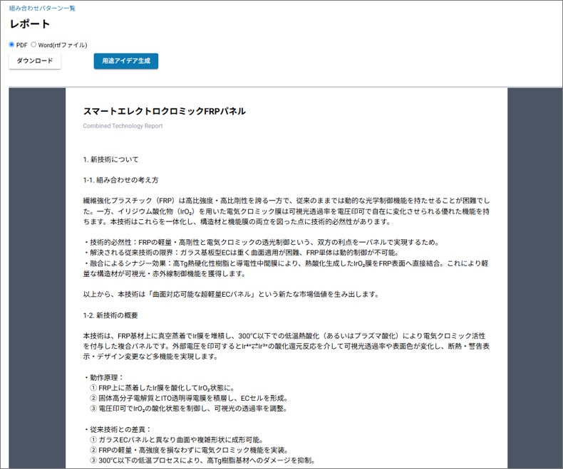 組み合わせによって定義された新技術の概要を1枚のレポート形式で出力することも可能