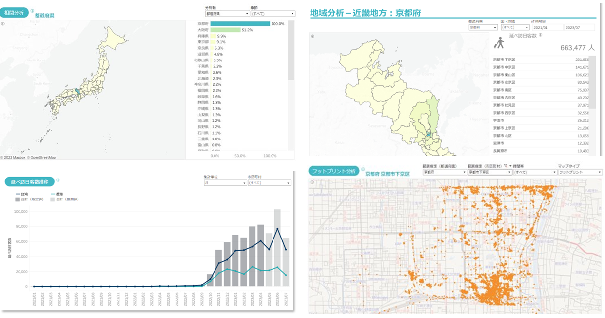 位置情報を用いているため、市区町村単位で延べ訪日客を確認できるほか、旅行先となる都道府県間の相関や、どこからどこへ向かったのかといった移動ルートも理解することができます。
