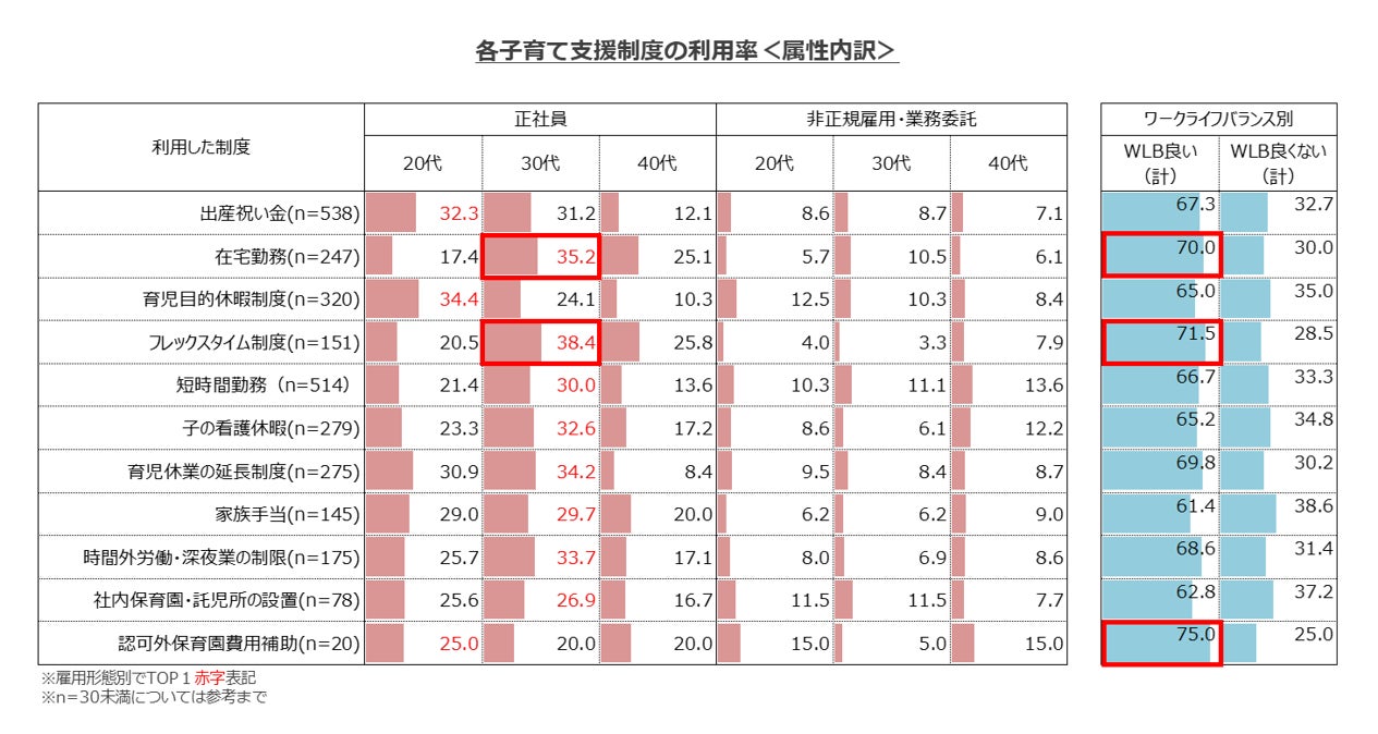 子育て支援制度の利用率をWLB別に見ると「在宅勤務」「フレックスタイム制度」「認可外保育園用補助」は「WLB良い」と回答した割合が7割超えとなりました。