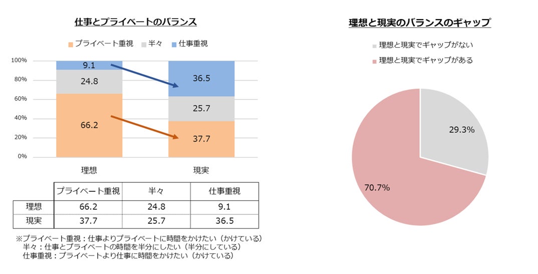 仕事とプライベートのバランスにおいて、理想と現実のギャップを感じている割合は約7割という結果に。全体では66.2%の人がプライベート重視の生活を送りたいと思っているものの、実際にその生活を送れている人は全体の37.7%となっています。一方で、仕事とプライベートのバランスが半々を理想としている人が24.8%いるなかで、現実でも半々と回答した方は25.7%と、理想と現実の差分はわずか0.9%となりました。