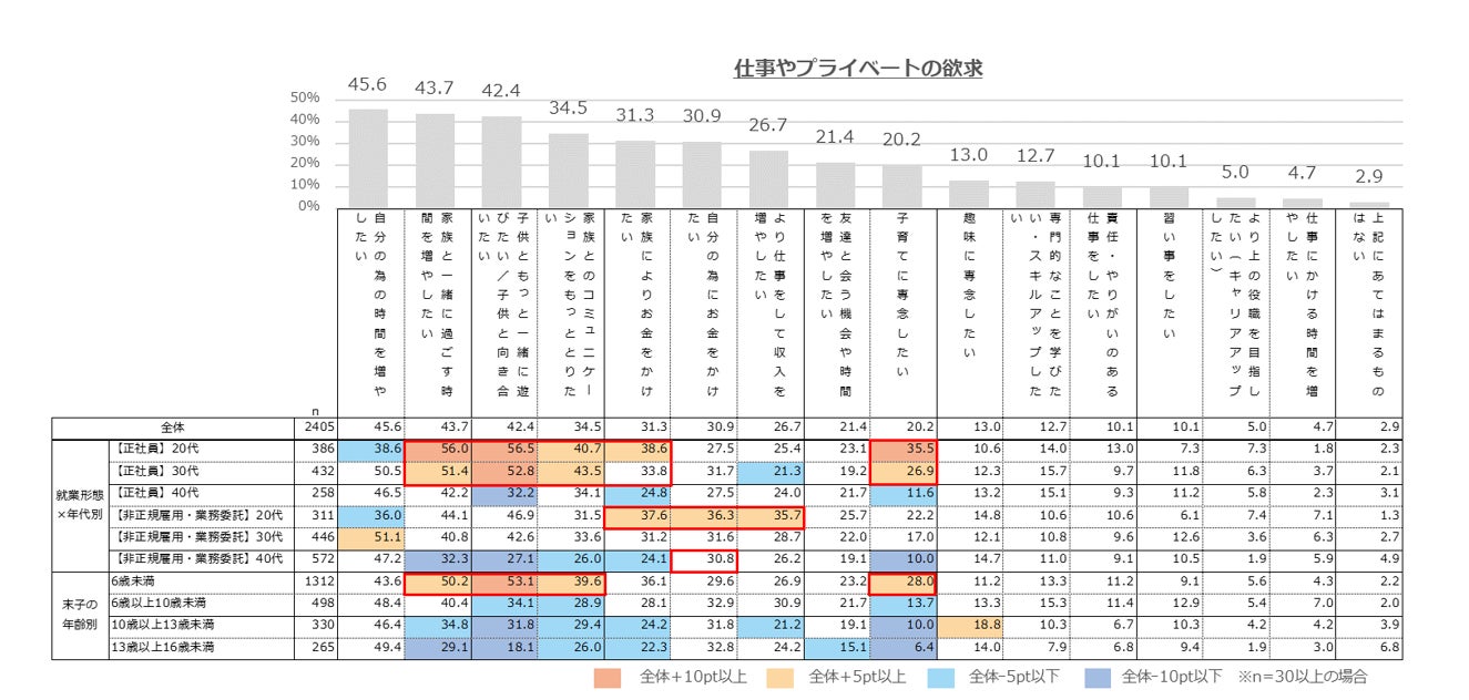 年代別に仕事やプライベートに関する欲求を見ると、20代のワーママは他の年代より家族や子供と過ごす時間を増やしたい、家族にお金をかけたいなど、意識が家族に向いているようです。