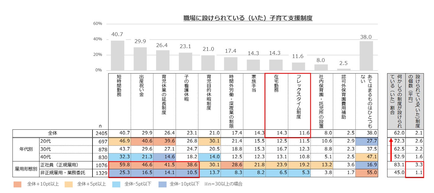 一方、会社が制度を導入している割合は「在宅勤務」が14.3%、「フレックスタイム制度」が11.6%と少ない結果に。特に、非正規雇用・業務委託での導入率が少ないようです。