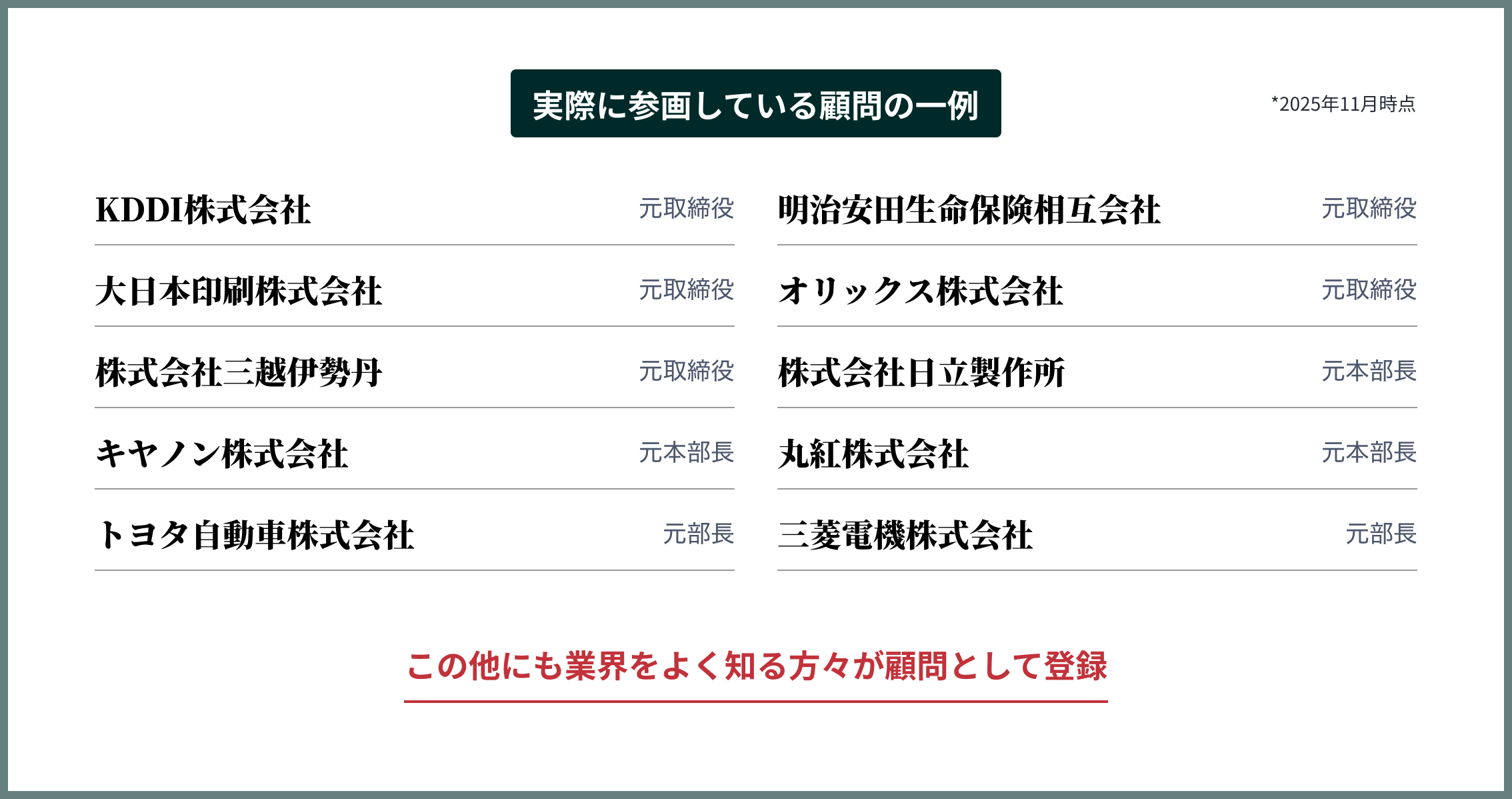 ノウハウ提供、営業組織強化、採用強化にコスト削減など営業以外のニーズもそれぞれの分野のエキスパートが顧問として参画し解決します。