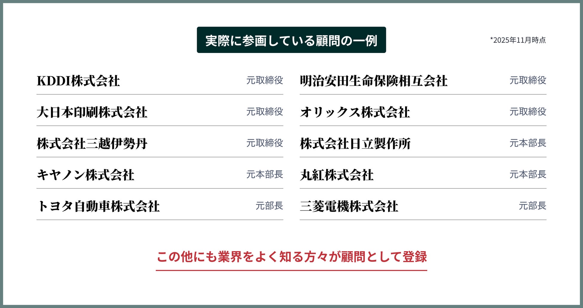 これまで顧問サービスでは、顧問の活動成果が不明瞭であっても、毎月高額な顧問報酬が発生するのが一般的でした。エキスパートハブでは月額15万円という大手顧問サービスよりもリーズナブルな料金体系(※)と、顧問の活躍に応じて費用が発生する成果報酬型を採用することで低コスト・低リスクに顧問を味方にすることが可能です。※ 当社調べ(2025年11月時点)