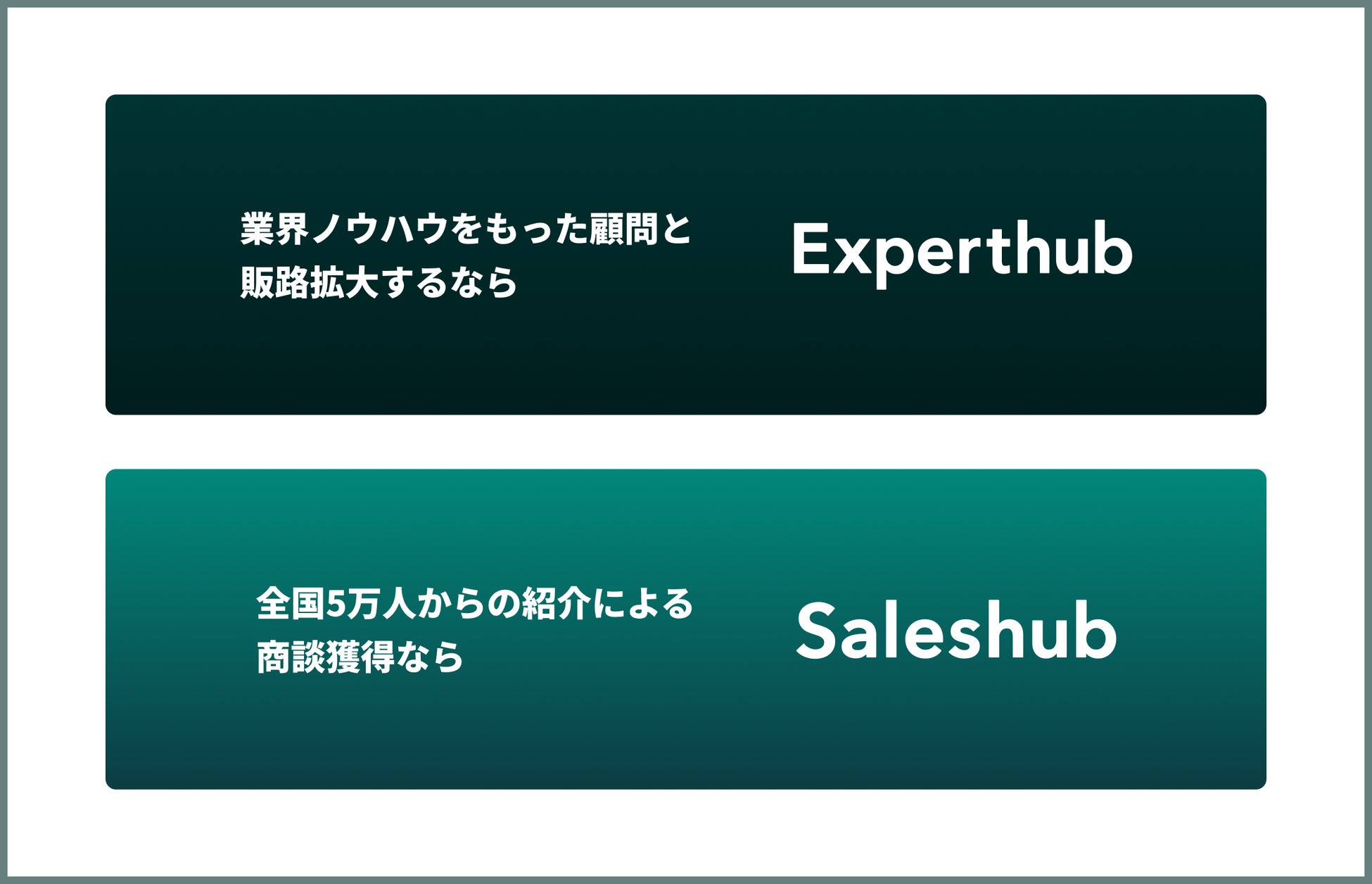 株式会社Saleshub(本社:東京都渋谷区、代表取締役:江田 学、以下Saleshub)は、新たに成果報酬型顧問サービス「エキスパートハブ」を提供開始いたしました。エキスパートハブは月額15万円というリーズナブルさと成果報酬型による低リスクさを併せ持つ顧問サービスです。入り込むのが難しい特定企業・業界の営業攻略を、その領域に長けた”エキスパート”が顧問として伴走することで実現。これにより今後は「セールスハブ」と「エキスパートハブ」との2つのサービスによる包括的な支援を可能にします。
