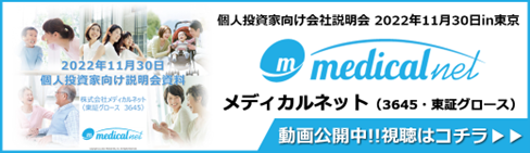 株式会社メディカルネット(本社:東京都渋谷区、代表取締役会長CEO:平川大、以下「当社」)は、11月30日(東京)に、日本証券新聞社主催の個人投資家向け説明会に参加し、その模様を撮影した動画が配信されましたので、お知らせいたします。