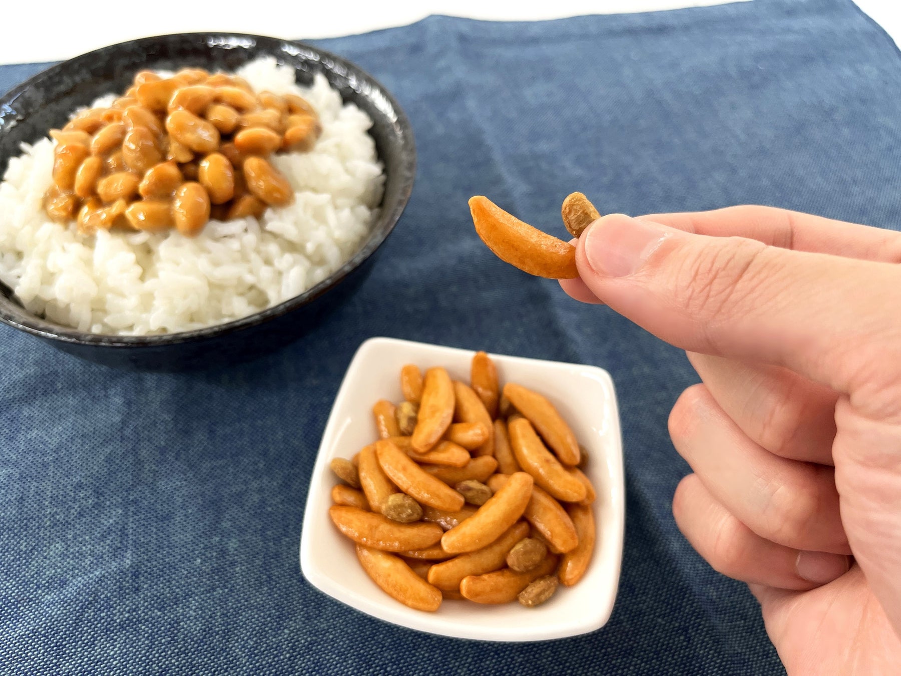 『亀田の柿の種 ドライ納豆入り』は、サクッとうまみが凝縮された栄養満点の醬油味のドライ納豆と、カリッと香ばしい亀田の柿の種を組み合わせています。ドライ納豆と柿の種を一緒に口に入れると、まるで納豆ご飯そのもののような味わいをお楽しみいただけます。お米でできた柿の種だからこそ実現できたヘルシーなつまめる納豆ご飯『亀田の柿の種 ドライ納豆入り』は、1袋106キロカロリーで、たんぱく質や大豆イソフラボンが摂取できます。おやつのように楽しく、ご飯のような満足感がある『亀田の柿の種 ドライ納豆入り』を、ぜひ体感してみてください。