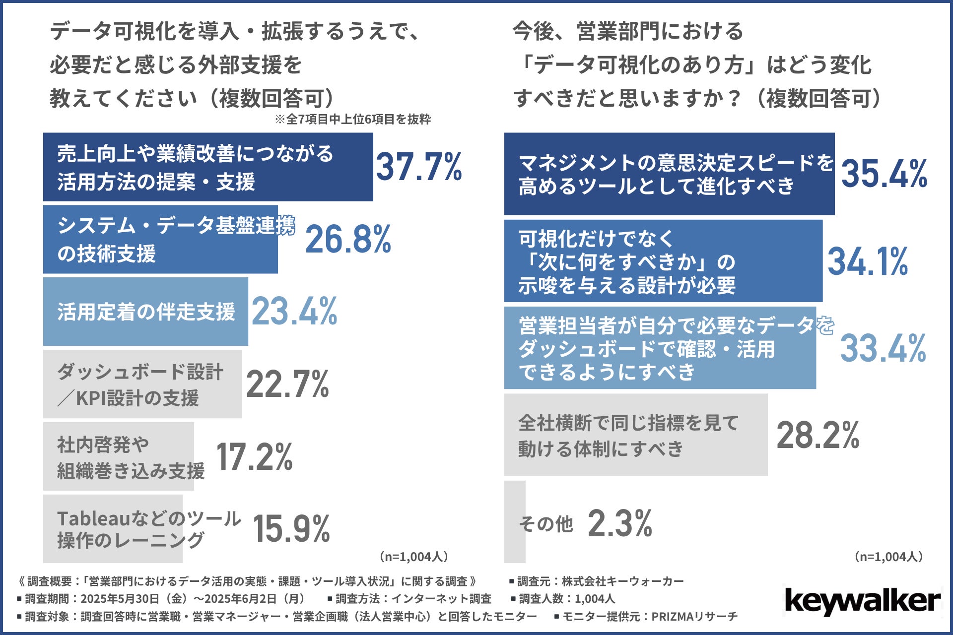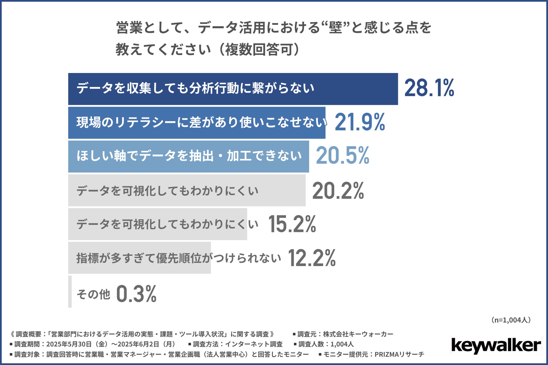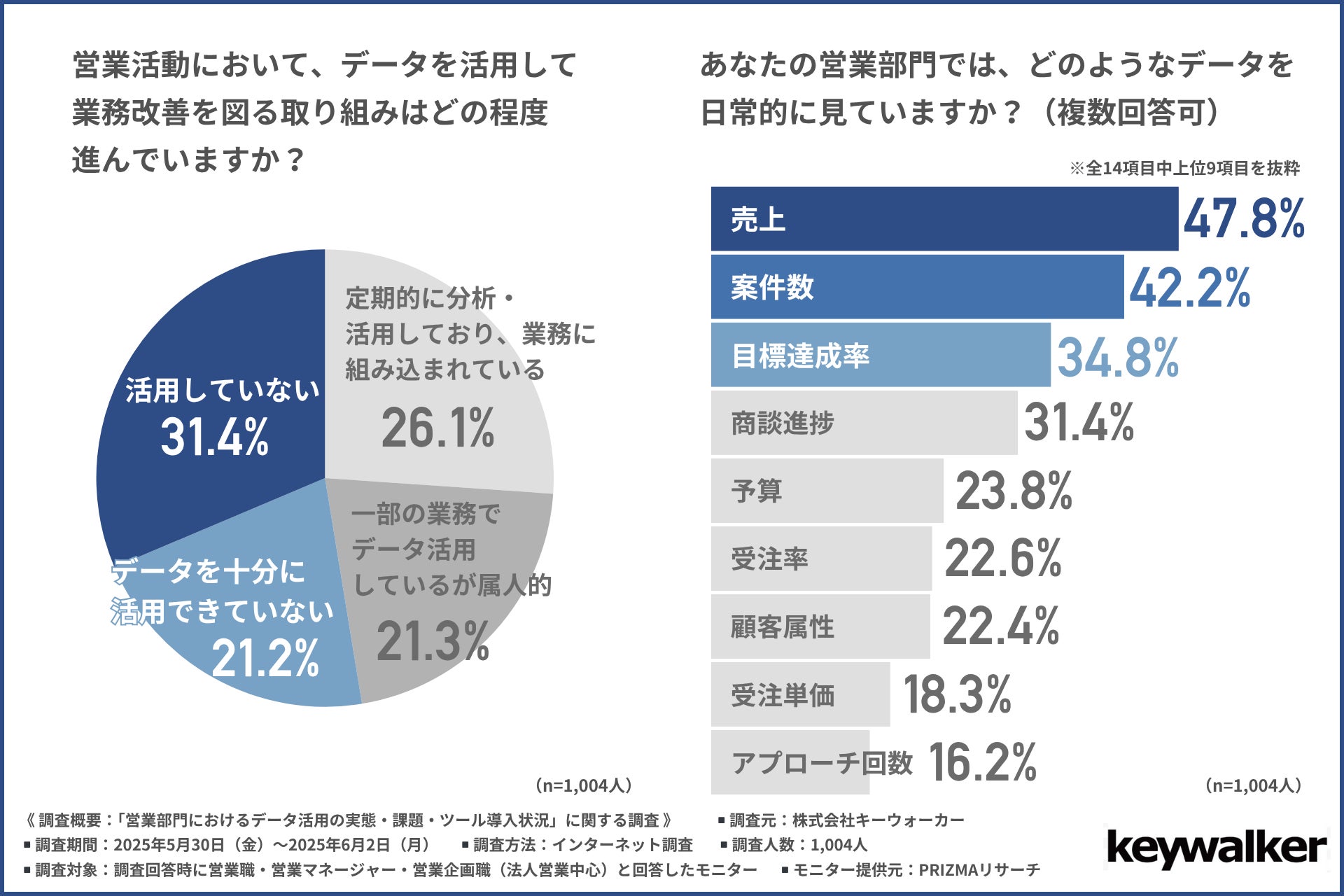 株式会社キーウォーカー(所在地:東京都港区、代表取締役社長:小林 一登)は、営業職・営業マネージャー・営業企画職(法人営業中心)の方を対象に、「営業部門におけるデータ活用の実態・課題・ツール導入状況」に関する調査を実施しました。