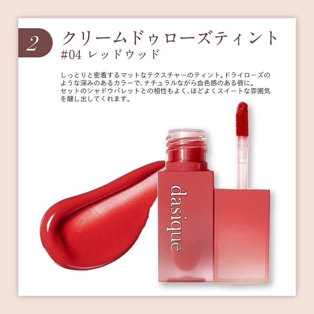 ティントやリップもデイジークが毎シーズン、シャドウパレットと同時発売する中心アイテムです。その中でもローズティントは今年発売したばかりの、旬なティント。ドライローズのような深みのあるカラーで、ナチュラルながら血色感のある唇に。さらに特徴として、”唇の縦シワを埋めムラなく密着”、”シルキーな質感で柔かくフィット”、”さらっとした唇を長時間キープ*”などなど、マスクを時代には欠かせないポイントをしっかり抑えつつ、質感にもこだわった一品です。これをきっかけにデイジークのティントの素晴らしさをご体験ください。